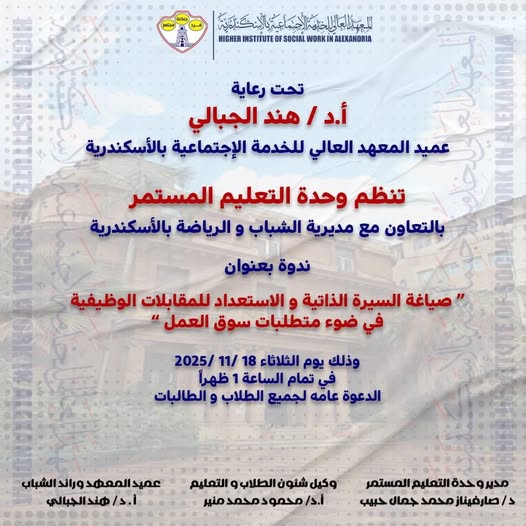 جميع الحقوق محفوظة © المعهد العالى للخدمة الإجتماعية بالاسكندرية عام 2024 - 2025