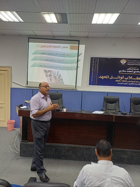 بتاريخ 15 / 10 / 2025 تم تنفيذ دورة تدريبية عن التخطيط الاستراتيجى والجودة الشاملة لمؤسسات التعليم العالى ، وقد افتتحت سيادتها الدورة بالترحيب بكافة العاملين بالجهاز الادارى بالمعهد وقد اشارت الى ان الدورة تستهدف توضيح جوانب التخطيط الاستراتيجى فى اطار معايير الاعتماد للجودة الشاملة لانه اضحى مسارا حتميا فى مسيرة التطوير والتحديث وفقا لتوجهات الدولة المصرية لتطوير منظومة التعليم العالى واكدت على ثقتها فى كافة الوحدات الادارية فى التعاون وتطبيق الخطط الاستراتيجية لتطوير المعهد وتحقيق فعالية وكفاءة المخرجات التعليمية ، وقد حاضر بالدورة الاستاذ المساعد دكتور عماد عبد المقصود رئيس قسم التخطيط الاجتماعى بالمعهد ومدير ادارة التدريب ، حيث بدء بطرح مناقشات مع العاملين حول مفهوم التخطيط وثم شرح مفهوم التخطيط الاستراتيجى وعناصره واهميته للمؤسسسات التعليمية وباعتباره احد المعايير الرئيسية التى تشمل كافة الوحدات الادارية والبنية التحتية والعناصر الاكاديمية بالمعهد ، هذا فى اطار رؤية ورسالة المعهد والخطة الاستراتيجية والاهداف الاستراتيجية لان التخطيط الاستراتيجى يعد المحرك والبوصلة للتوجه نحو المستقبل من خلال التحليل الرباعى للمعهد والدراسة الدقيقة لنقاط الضعف والقوة الداخلية ورصد التحديات الفرص بالمجتمع والبيئة المحيطة وبناء الخطة الاستراتيجية من اجل استثمار نقاط القوة ومعالجة نقاط الضعف والوقوف على الفرص بالمجتمع التى يمكن استثمارها والتحديات التى تتطلب مواجهتها ، للارتقاء بالمخرجات التعليمية وتحقيق الميزة التنافسية فى ظل المستجدات والمستحدثات المعاصرة ، واكد على اهمية التطوير فى منظومة الهيكل الادارى والاجراءات الادارية من خلال استثمار الامكانات التكنولوجية والتوسع فى اتاحة الاعمال الرقمية لتيسير الخدمات للطلاب ، ثم تم تطبيق مناقشات فى نهاية الدورة حول الرؤية والرسالة وضرورة المشاركة من كافة العاملين بالمعهد فى تطوير وكذلك التعاون والاسهام فى تنفيذ الخطة الاستراتيجة للتقدم انحو الاهداف المبتغاة
