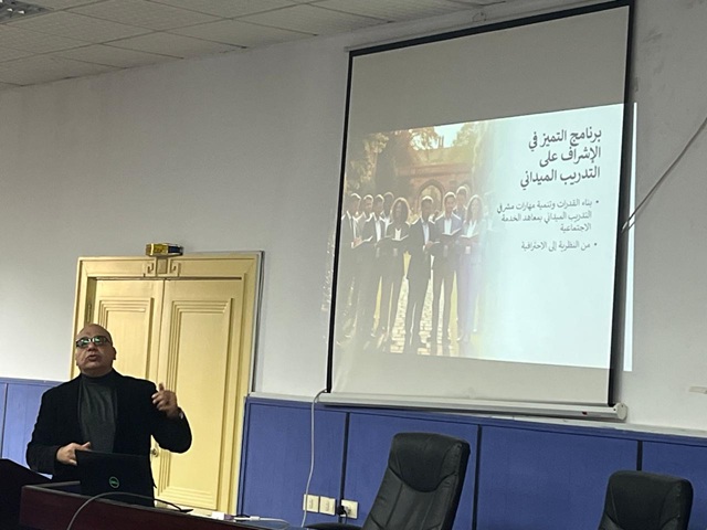 تحت رعاية أ.د هند الجبالى عميد المعهد ، بتاريخ 4 /2 / 2026 فى اطار الحرص على تطوير الاداء المهنى للعملية التدريبة بوحدة التدريب الميدانى بالمعهد فى ظل منظومة الجودة الشاملة بمؤسسات التعليم العالى ، واهمية ارتقاء بمستوى الاداء المهنى لمشرفى التدريب الميدانى وتحقيق اهداف وحدة التدريب الميدانى فى اكساب مهارات وآليات الممارسة المهنية لطلاب التدريب بالفرق الدراسية الاربعة ، وقد حاضر بالدورة أ.م.د عماد عبد المقصود – رئيس قسم التخطيط الاجتماعى ومدير ادارة التدريب بالمعهد ،وبداية استعرض اهمية التدريب الميدانى باعتباره الجسر بين ما يتم تدريسه للطلاب من مادة نظرية فى التخصصات المختلفة وتمكين الطلاب من التطبيق العملى فى مؤسسات التدريب الميدانى فى مختلف مجالات الممارسة واستعراض "الجدارات التعليمية" وربط النظرية بالواقع واهمية التوجيه فى مساعدة الطالب على تطبيق الاطار النظرى فى واقع الممارسة المهنية ثم "الجدرات المعرفية" مثل القدرة على شرح سبل تطبيق النظريات ومعرفة القوانين واللوائح المنظمة لعمل مؤسسات الرعاية الاجتماعية ، والالتزام باخلاقيات المهنة ، مثل "الجدارات التدريسية والمهارية" مثل مهارة التوجيه الفنى والنمذجة والتقييم الموضوعى ، "والجدارات الشخصية والقيادية" ليصبح المشرف الميدانى قدوة ومؤثر والذكاء العاطفى ، التواصل الفعال ، والمرونة وحل المشكلات وأن دور مشرف التدريب الميدانى له دوره الادارى والتعليمى والتدعيمى ثم استعرض مهارات التقييم الموضوعى والبناء ، والجدرات المهارية والسلوكية والجدرات التكنولوجية بما يتواكب مع متطلبات عصر التكنولوجيا والمعرفة وتفعيل الاشراف الرقمى ثم اختتمت الدورة بتطبيق ورشة عمل والمناقشات ، ثم تم تنفيذ ورش عمل على نموج للجدارات المهنية بمشاركة السادة مشرفى التدريب الميدانى ومناقشة مخرجات الورشة وتقييمها .